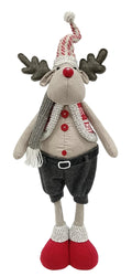 Elegante renna bambino in piedi in poliestere, nei toni grigio e bianco: cappello lungo, sciarpa coordinata, gilet effetto maglia con bottoni e morbide finiture tipo pelliccia su scarponcini e bordo cappello.